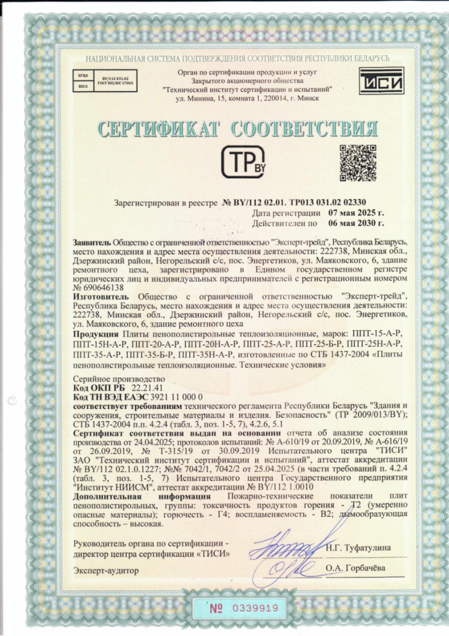 Кроме того пенопласт является негорючим теплоизоляционным материалом, мгновенно затухающим без постоянного воздействия огня. Пенопласт производства ООО «Эксперт-трейд» выпускается в соответствии с СТБ 1437-2004 и не уступает аналогичной продукции зарубежного производства.